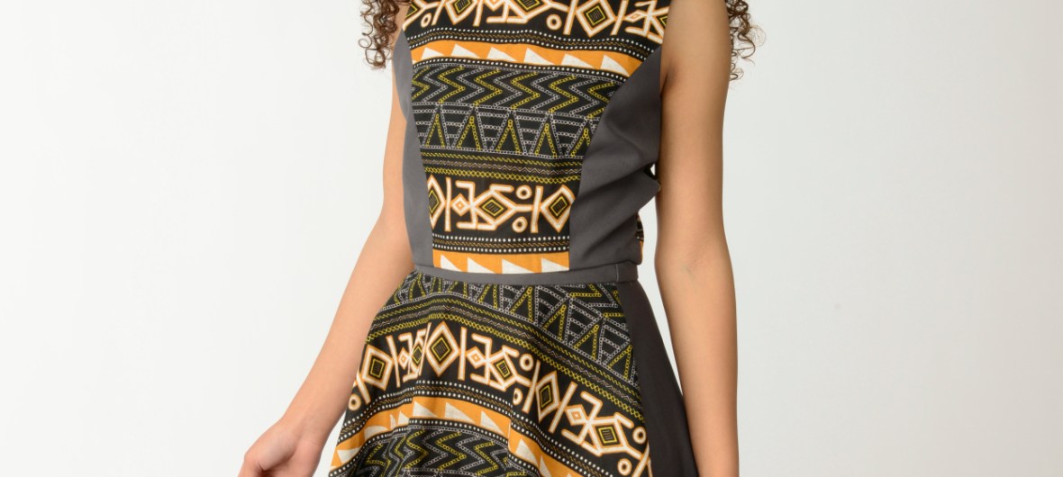 Top has side panels with complimenting fabric; high round neck line. Skirt has a back panel with complimenting fabric; A-Line shape and high-waisted fit with waist band. Metal zipper closure