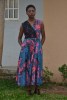 Details: Print fabric in bright pink and dusty blue. Cross-front. Lace layered on right-front side. Zipper positioned on back centre. With side pockets.