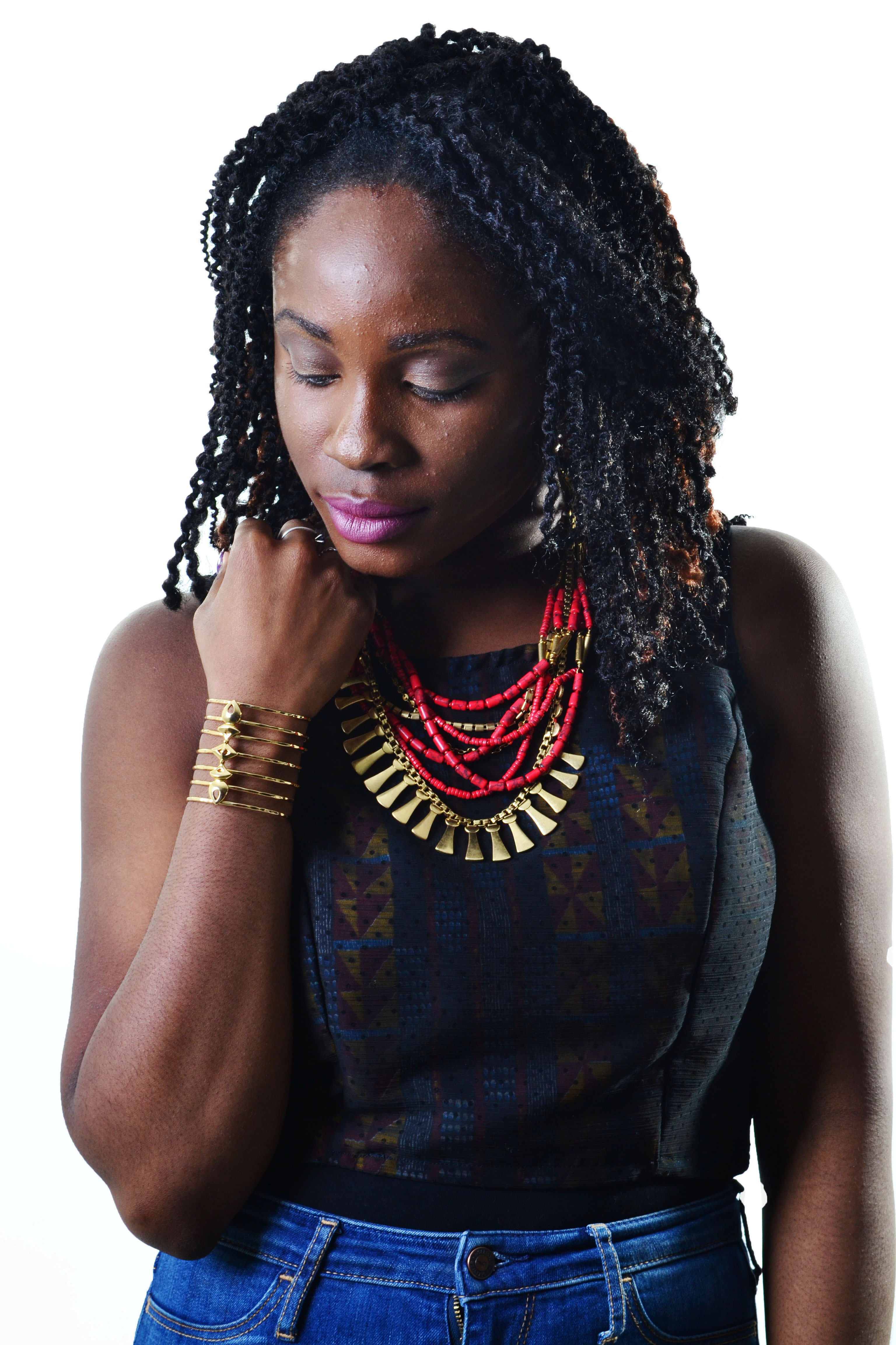 A Fitted crop top, sleeveless. Ankara lining and chiffon layer. Back details include aesthetic buttons for fastening.