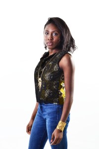 A fitted cowl front crop. Front panel in net detail over the ankara. Back of crop in ankara.