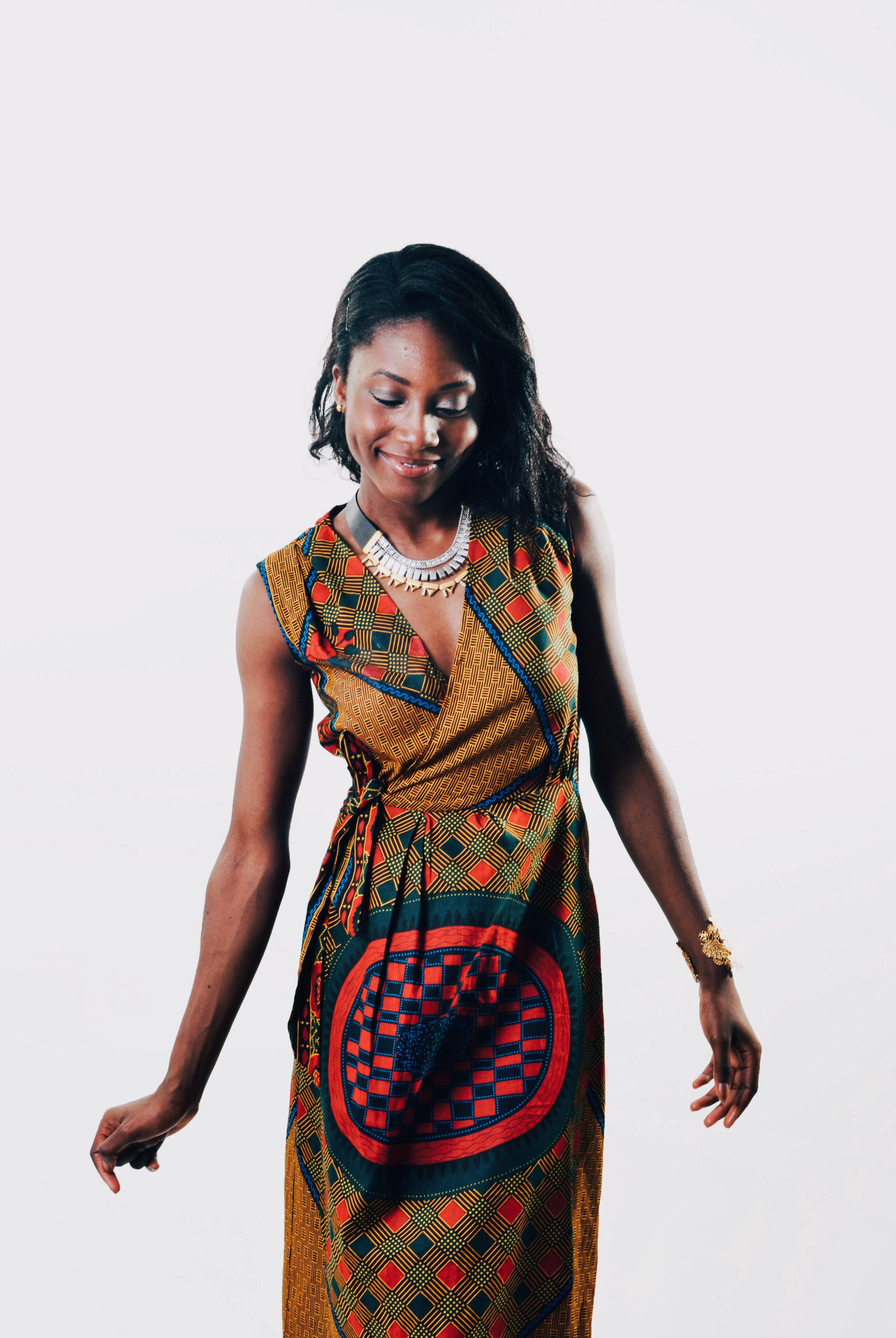 One-piece wrap dress, also worn as a dress waist coat. Top of item is fitted, with an A-line flow at the bottom.