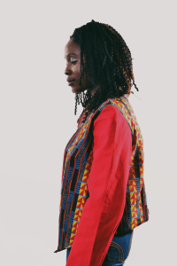 An Afro-fused jacket; plain fabric sleeve with ankara-detailed hem. Contoured hem details in jacket