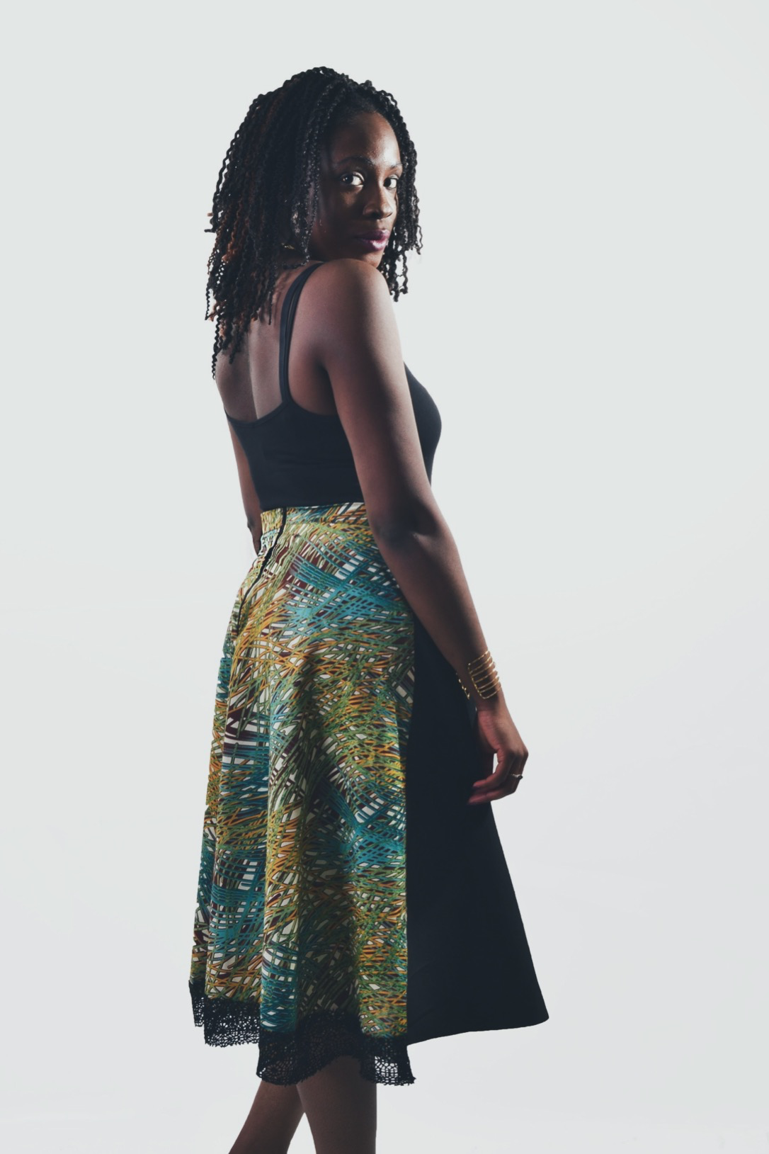 A-Line high-waist skirt. Back panel and matching waist band in print pattern; front panel in contrasting plain fabric